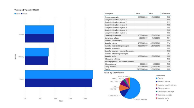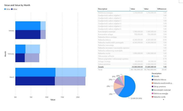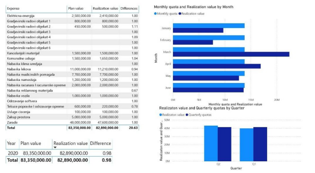 Prvi izveštaj koji se može izraditi uz pomoć Power BI je stepen izvršenja finansijskog plana, tako što će se u odnos staviti odobren finansijski plan sa trenutnom realizacijom. U našem slučaju analiza je izvršena na kraju prvog kvartala.