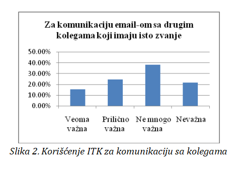 2. primenu IKT u organizacijama za obučavanje. Upitnik se sastoji od pitanja: kod kojih je odgovor dat kao Likertova skala, gde ispitanik zaokruživanjem jedne od ponuđenih alternativa iznosi stepen prihvatanja, odnosno neslaganja sa sadržaj pitanja i njegovim uticajem na izazivanje stresa. Naznačeni odgovori imaju sledeće značenje: 1-apsolutno se slažem, 2- slažem se, 3-ne znam, 4- ne slažem se, 5- apsolutno se ne slažem; zatim pitanjima sa da/ne odgovorima, i otvorenim pitanjima kod kojih se od ispitanika očekuje da upiše odgovor. Uzorak istraživanja obuhvata 32 radne organizacije. Ukupno 226 ispitanika od kojih su 54 osobe muškog pola, i 170 ženskog. Po stručnoj spremi raspodela ispitanika je sledeća (stručna sprema-broj ispitaniak): III-1, IV-13, VI-21, VII/1-184, VII/2-7. Po starosnoj strukturi raspodela ispitanika je sledeća (starosna struktura-broj ispitaniak): od 20-30 god.-30, od 31-40 god.-72, od 41-50 god.-48, preko 51-48, i 35 ispitanika nije odgovorilo na ovo pitanje. Po ukupnom radnom stažu (broj godina radnog staža-broj ispitanika): dо 5 godina -45, od 6 do 10 godina -50, od 11 do 15 godina -73, od 16 do 20 godina -28, od 21 do 25 godina -23, od 26 do 30 godina -20, рrеко 30 godina -21, nedostaju podaci za dva ispitanika. Iz istrazivanja izdvajamo ona pitanja i odgovore za koje mislimo da su interesantni.Pripremljenost zaposlenih pre stupanja na radno mesto na kome se trenutno nalaze i stvarna obučenost za njega je veoma zadovoljavajuća. Samo 6% ispitanika pre stupanja na radno mesto je smatralo da nije dovoljno pripremljeno i obučeno za njega, a 8% je to stvarno i bilo. Ispitanici su zadovoljni ukupnom obukom i podrškom koju su imali prilikom stupanja na novo radno mesto i to: 20% smatra da je ona bila odlična, 72% dobra i 8% dovoljna. Odgovori ispitanika na pitanje »Koji od navedenih razloga, ako postoji, Vas sprečava da se obučavate i usavršavate iz vaše oblasti« su sledeći. Na prvom mestu po broju ispitanika koji su potvrdili postojanja barijere za obučavanje je nedostatak novca za usavršavanje sa 45% ispitanika, na drugom mestu nejasnoća koje informacije i/ili mogućnosti su dostupne ispitanicima, sa 31,86% ispitanika. Treće mestu tj. treći razlog zbog kojeg ispitanici su sprečeni da se obučavaju je što obuke koje oni žele da pohađaju im nisu dostupne- 19,46% ispitanika. Nakon toga sledi 11,50% ispitanika koji se slažu da nemaju dovoljno vremena da pohađju kurseve i da troše vreme na usavršavanje. 6,64% ispitanika smatra da im obuka i razvoj trenutno nisu prioritetni, a 3,10% ispitanika nema potrebu da se usavršava (to su u većini slučajeva ispitanici koji uskoro idu u penziju). Glavni izvor inspiracija i ideja koju traže za svoj posao i usavršavanje ispitanici pronalaze u knjigama, novinama i drugim publikacijama (obrazovne, biznis, vladine) čak 78,32%, zatim u razgovoru sa kolegama 69,91%, sledi internet, intranet, forumi i sl. sa 59,29% i konferencije i seminari sa 50%. Na prethodna dva pitanja ispitanici su mogli da čekiraju više odgovora. Što se tiče obučenosti za primenu informacionih i komunikacionih tehnologija na poslu, 15% smatra da je odlično obučeno, a 52% smatra da je dovoljno obučeno, a 30% ispitanika smatra da nije dovoljno obučeno.Stavovi ispitanika prema primeni ITK za učenje i podučavanjezaposlenih u korporacijama prikazani su na sledećim slikama. Ispitanici IKT primenjuju najčešće za komunikaciju putem mejla sa kolegama, 15.38% veoma često, 24.43% često, 38.46% nebaš često i 21,72% nikako (vidi sliku 2).