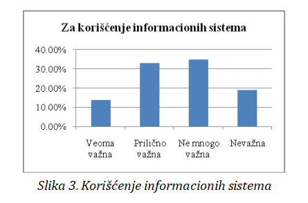 Zatim sledi korišćenje informacionih sistema 13.62% veoma često, 32.86% često, 34.74% nebaš često i 18.78% nikako. (vidi sliku 3).