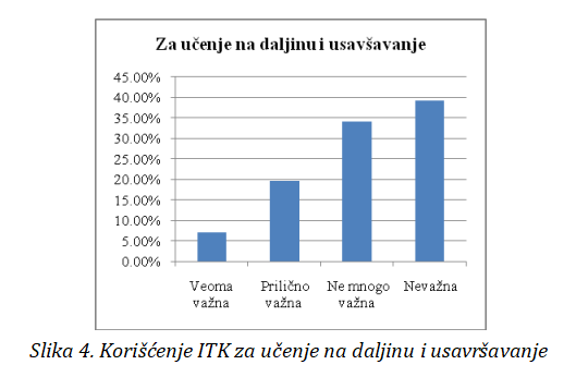 IKT za učenje na daljinu i usavršavanje ispitanici koriste: 7.01% veoma često, 19.63% često, 34.11% nebaš često i 39.25% nikako. (vidi sliku 4).