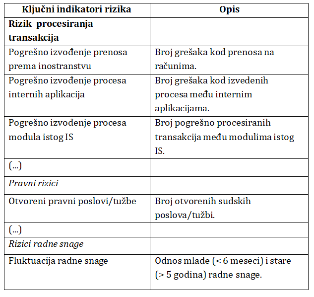 Indikatori rizika su statistički i/ili metrički podaci, često financijski, koji mogu pružiti uvid u rizičnu poziciju poslovanja banaka. Ovi se indikatori obično redovno preispituju kako bi banke bile upozorenie na promene koje mogu biti indikativne za problem povezan s rizikom. Takvi su indikatori, npr., broj propalih transakcija, stope prometa po zaposlenom i učestalost i/ili ozbiljnost grešaka i propusta. Nekada se može postaviti pretpostavka o riziku banaka bez detaljnih podataka o tome, kako i gde se u banci dešavaju štetni događaji iz operativnog rizika, pa čak i bez podataka o broju i veličini operativnih gubitaka. Radi se o drugoj kategoriji identifikovanja i merenja anomalija, koje za razliku od merenja realizovanih finansijskih posledica označavaju potencijalni gubitak odnosno mogućnost nastanka gubitka. Nazivaju se ključnim indikatorima rizika, koji sa jedne strane pomažu identifikovanju mana u procesima i sistemima, a sa druge strane nude uvid u kom pravcu se kreću-razvijaju greške, odnosno koje kontrolne tačke najčešće zakažu. Gubici i mere kontrolnih tačaka koje su zatajile, ključni su podaci ispitivanog modela podataka. Primer takvog indikatora rizika na području procesiranja transakcija jeste broj grešaka kod međunarodnih računskih prenosa. Njihov broj može da raste i zbog pogrešnog rada nekog procesa odnosno procedure, koja je povezana samim prenosom transakcije. U međunarodnim transakcijama (odnosno delimičnih transakcija) prenosa sredstava između dva finansijska preduzeća, bankarske grupe moraju istovremeno izvršiti i odgovarajuća knjiženja u glavnu knjigu pojedinih finansijskih preduzeća. Ponekad će se ista knjižnja uskladiti, a ponekad i ne. Razlike mogu biti rezultat različitih knjigovodstvenih sistema, tehničkih poteškoća (greške u programu, površnost kod ručnih knjiženja itd.), a mogu biti i posledica nekih drugih privremenih uzroka koji obično ne zahtevaju dalje intervencije.