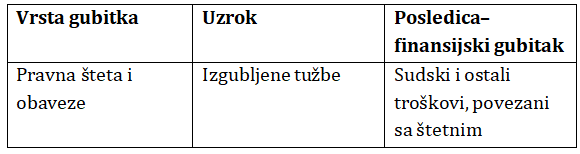 · događaji vrste „niska frekvencija-visoki gubici“; mogu se imenovati i kao „veći događaji“ (npr. velike prevare na polju trgovine, veće tužbe, prirodne katastrofe) i