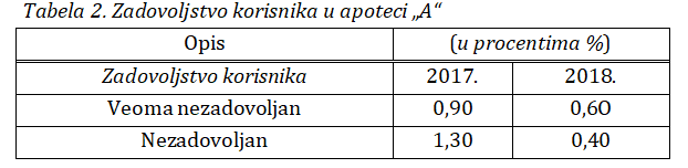 Rezultati ispitivanja zadovoljstva korisnika u apoteci “A” - celokupnom uslugom u periodu 2017-2018. godine - prikazani su u tabeli 2. Ispitivanje izvršeno anketiranjem 1000 pacijenata, tokom decembra 2017. i decembra 2018. godine.