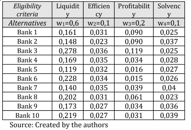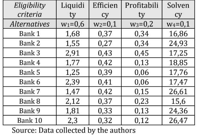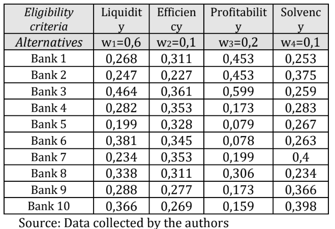 Developing an appropriate decision support system for choosing a bank for the purpose of reducing money laundering risk and the grey economy is the problem that will be solved by a combination of ANP methods and TOPSIS(Bobar et al., 2015). Eligibility criteria based on the alternatives that will be evaluated in this case are (Đukić, 2011): K1- Bank liquidity; K2- Efficiency; K3- Bank Profitability and K4- Bank solvency.