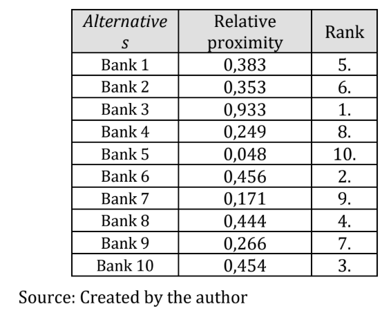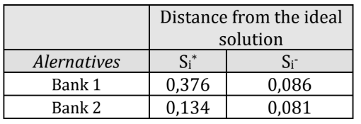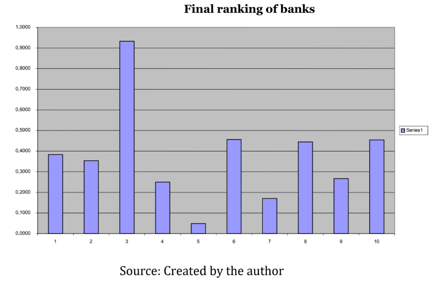 Based on the TOPSIS method implemented, a obtained solution is that the most suitable investment bank is the bank 5, which has the highest ranking among all alternatives.