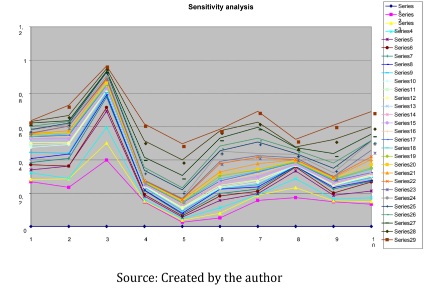 The stability of the obtained solution in case of change of criteria can be performed by the sensitivity analysis procedure(Bergman & Lundberg, 2013). Figure 1 shows the impact of the criteria on each bank or alternative.