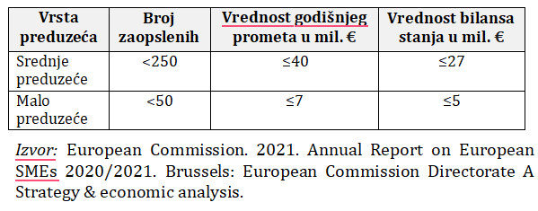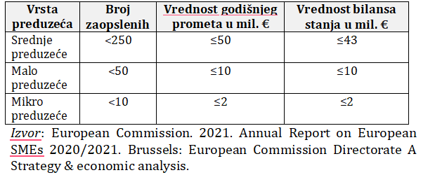 U skladu sa odredbama preporuke preduzeća se katgorizuju u okviru dve grupe: mala preduzeća i srednja preduzeća. Mala preduzeća su ona koja imaju do 50 zaposlenih, koja ostvaruju godišnji promet u vrednosti do 7 miliona evra i čija godišnja vrednost bilansa stanja ne prelazi 5 miliona evra. U slučaju preduzeća srednje veličine broj zaposlenih ne prelazi 250, vrednost godišnjeg prometa može dostići do 40 miliona evra, a bilans stanja beleži vrednost do 27 miliona evra (Tabela 1).