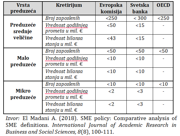 U narednoj tabeli je dat uporedni prikaz kriterijuma za klasifikaciju malih i srednjih preduzeća koje primenjuju Evropska komisija, Svetska banka i Organizacija za ekonomsku saradnju i razvoj (OECD).