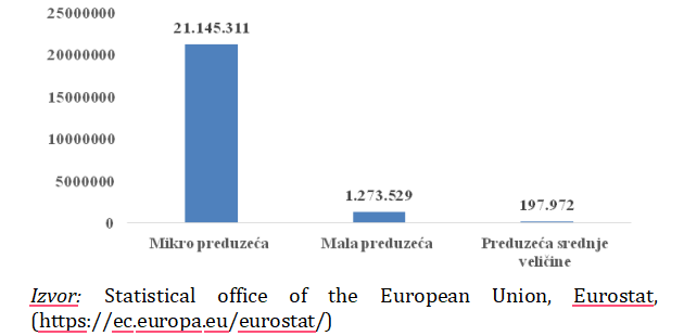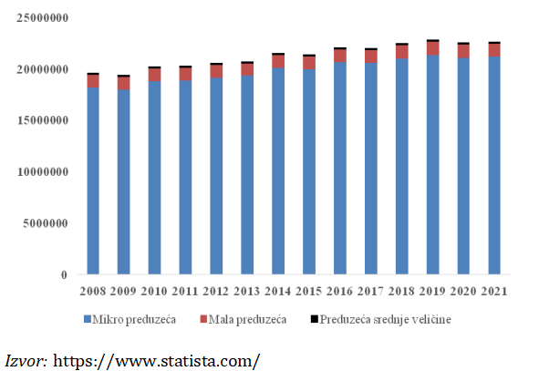 Od 2008. godine pa nadalje u nefinansijskom poslovnom sektoru Evropske unije preovlađuju mikro preduzeća koja zapošljavaju do 10 radnika (Grafikon 1). Jednopersonalna i porodična preduzeća su veoma atraktivan oblik preduzetništva u Evropi. U kretanju broja malih preduzeća nisu primećene značajne oscilacije tokom posmatranog perioda, dok su preduzeća srednje veličine ostvarivala najniže učešće. Recimo, samo tokom 2020. godine u Evropskoj uniji je u okviru nefinansijskog poslovnog sektora funkcionisalo svega 199.362 preduzeća srednje veličine, nasuprot 21.044.844 mikro preduzeća (93% svih malih i srednjih preduzeća).