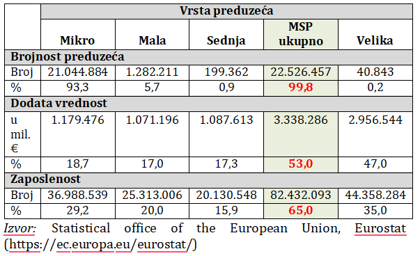 Mala i srednja preduzeća zauzimaju veoma važno mesto u nefinansijskom poslovnom sektoru Evropske unije. Prema podacima Evropske komisije prezentovanim u godišnjem izveštaju o malim i srednjim preduzećima iz 2021. godine, više od 21 milion mikro preduzeća, malih preduzeća i preduzeća srednje veličine je aktivno poslovalo tokom 2020. godine u Evropskoj uniji. Od ukupnog broja preduzeća koja su poslovala u okviru nefinansijskog poslovnog sektora čak 99,8% su bila mala i srednja preduzeća. Ona su doprinela stvaranju 53% ukupne dodate vrednosti i obezbedila čak 65% svih radnih mesta. Veoma je važno napomenuti da je učešće mikro preduzeća, odnosno preduzeća koja maksimalno zapošljavaju do 10 radnika, bilo dominantno i iznosilo 93%.