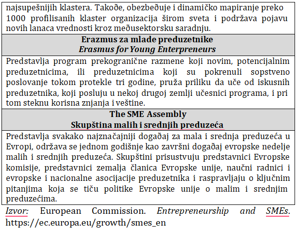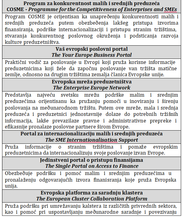Evropska komisija pruža podršku malim i srednjim preduzećima i podstiče njihov razvoj putem različitih paketa mera. Na zvaničnoj internet stranici Evropske komisije dostupne su detaljne informacije o svim programima (Tabela 5).