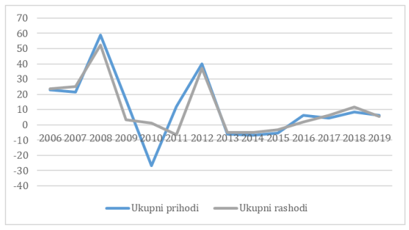 Na grafikonu 1 predstavljen je relativan trend ukupnih prihoda i ukupnih rashoda budžeta AP Vojvodine za vremenski period 2006- 2019. godine. Prosečan rast ukupnih prihoda iznosi 10.89%, dok su ukupni izdaci prosečno povećani za 6.62%. Kao što se može uočiti, zabeležen je intenzivniji rast ukupnih primanja u odnosu na ukupne izdatke, pri čemu je najveći rast zabeležen 2012. godine od 39.88%. S druge strane, najveći pad ukupnih primanja je evidentiran 2010. godine od 26.75%, dok su istom periodu ukupni izdaci porasli za 1.25%.