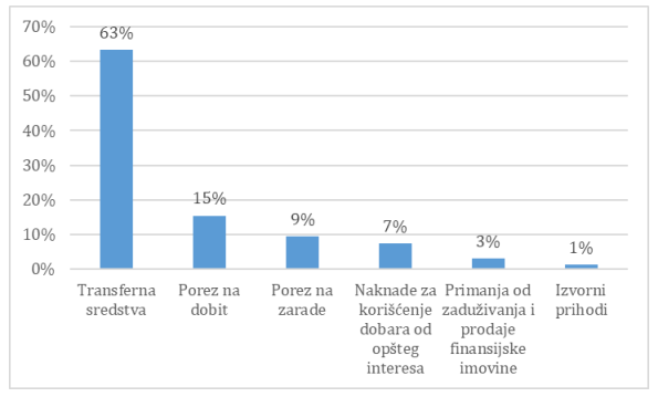 Na grafikonu 2 prikazana je struktura ostvarenih prihoda budžeta AP Vojvodine u 2019. godini. Na osnovu prezentovanog, može se zaključiti da transferna sredstva čine 63.3% ukupno ostvarenih prihoda. Prihodi po osnovu poreza na dobit čine 15.4% ukupno ostvarenih prihoda, dok ostali prihodi, primanja i naknade ne prelaze 10% ukupno ostvarenih prihoda budžeta AP Vojvodine u 2019. godini.