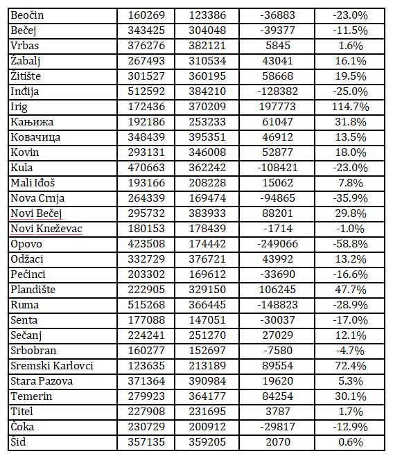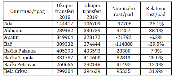 Tabela 1 prikazuje apsolutan i relativan trend ukupnih transfera po opštinama u AP Vojvodini za 2019. godinu. Pozitivan relativan trend je zabeležen u više od 50% posmatranih opštinama, pri čemu je najveći rast evidentiran u Irigu (114.7%) i Sremskim Karlovcima (72.4%). Suprotno, ukupni transferi su umanjeni za 58.8% u Opovu što predstavlja najveći pad u odnosu na ostale opštine u AP Vojvodini za 2019. godinu.