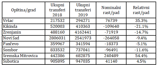 Nakon analize ukupnih transfera po opštinama, potrebno je prikazati i kretanje transfernih sredstava po gradovima u AP Vojvodini. Kao što se može uočiti, primetan je pozitivan relativan rast u Vršcu, Sremskoj Mitrovici i Subotici, dok je u ostalim gradovima evidentiran manji iznos ukupnih transfera u 2019. godini. Najveći rast ukupnih transfera je zabeležen u Sremskoj Mitrovici (54.4%) i Vršcu (35.3%), dok su transferna sredstva najviše umanjena Kikindi (-21.1%) i Zrenjaninu (-14.7%).