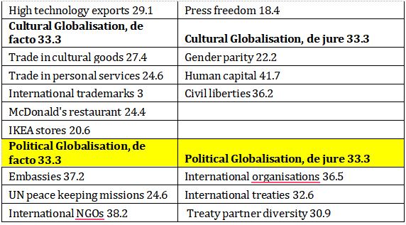 3. Political globalization - the political situation of a country de facto has segments: Embassies, UN peace keeping missions and International NGOs. Political globalization de jure has segments: International organizations, International treaties and Treaty partner diversity.