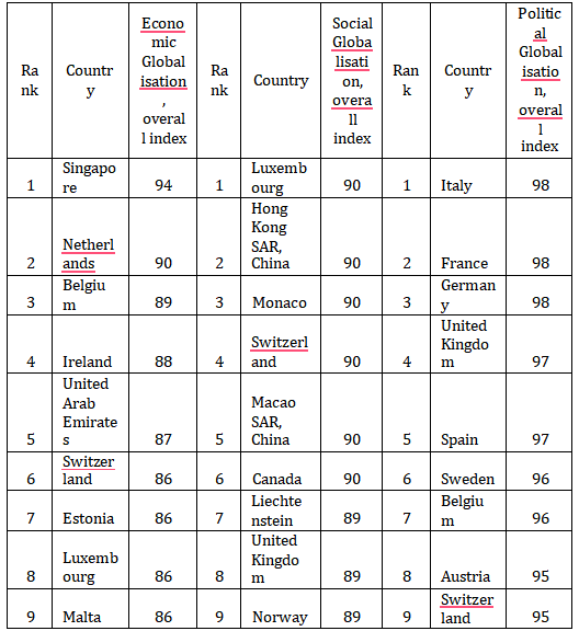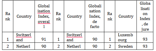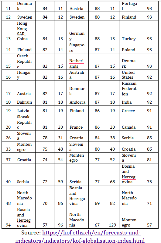 The following table shows the values of the globalization index for the leading 20 countries of the world and surrounding countries, which once formed a single country (Serbia, Macedonia, Croatia, Slovenia and Bosnia and Herzegovina). The table shows the Globalization Index values, overall, but also de facto and de jure values for 2020.