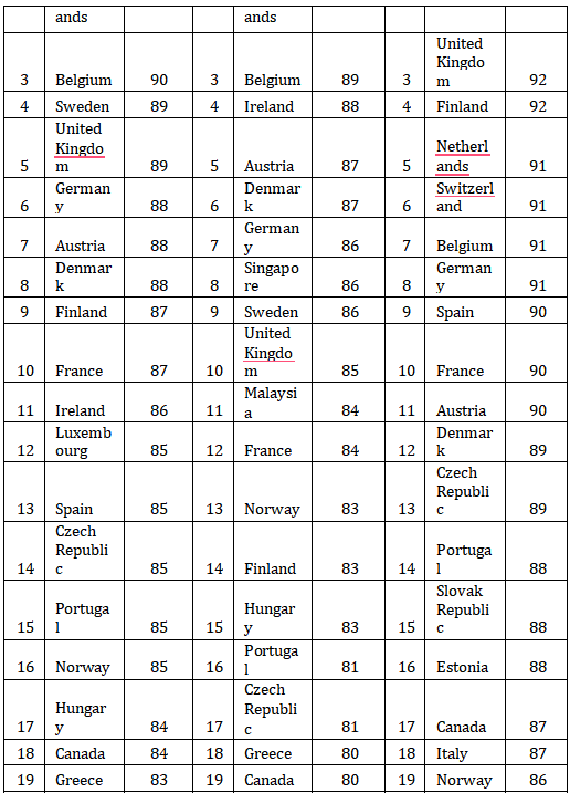 Based on the results in table number 2, we can conclude that Switzerland has the highest index values, total and de facto value. However, the de jure value for Switzerland is somewhat lower, so the country is in 6th place. Of the countries of circulation, Croatia and Slovenia are the best positioned countries, 26th and 31st respectively. We can also see that Serbia is much better positioned compared to Macedonia, Montenegro and Bosnia and Herzegovina.