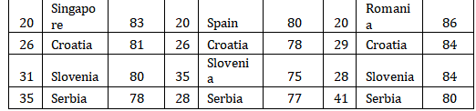 Croatia is the best-ranked country in 2012, which is in 33rd place, followed by Serbia in 53rd place, BiH in 61st place and Macedonia in 70th place. Compared to 2012, the ranking places did not change significantly in the analysis of these countries, while there were changes at the world level because each of the mentioned countries had a slight shift in the ranking up or down and this affected the other countries.