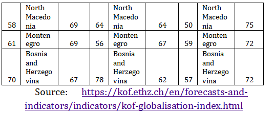 KOF analysis, the best ranked country is still Croatia, which is in 33rd place, the same as in 2013, followed by BiH in 50th place, and which has improved compared to Serbia and took second place, so that Serbia is now third in this analysis, it is in 63rd place, which is 10 places below compared to 2013 and Macedonia, which is in 74th place. Compared to 2013, the ranking places did not change significantly in the analysis of these countries, except for the exchange of places in the analysis of the observed countries, where BiH is in a better position compared to Serbia, which was not the case the previous year.