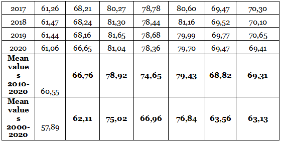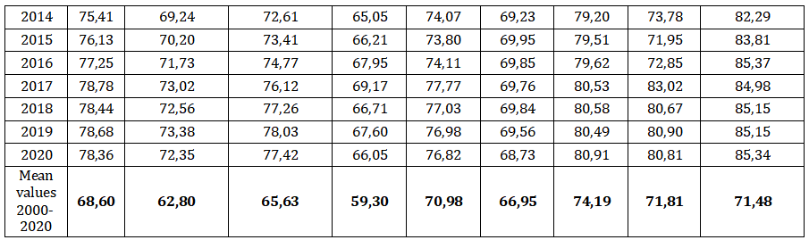 Below, Table 4 shows the values of the KOF globalization index for the analyzed countries of circulation in the period from 2000-2020. years. For the purposes of dynamic analysis of changes in the value of the KOF index, mean values were calculated for the period 2000-2010, then for 2010-2020 and for the entire analyzed period. It is important to point out that we looked at the deviations of the mean values for each country from the mean values for all countries of the world according to periods.