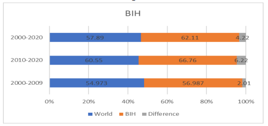 The results of the globalization index - KOF for BIH by period show that the biggest deviation is in the second period, more precisely in the period 2010-2020. (6,22). The mean value of the KOF index for the period 2000-2009. shows a positive difference in favor of BiH, which is significantly higher in the following period. Nevertheless, viewed as a whole, BiH has a higher mean value of the KOF index by 4.22 index points.