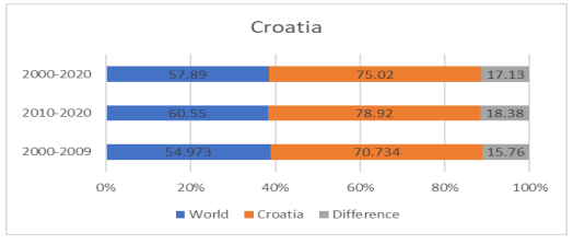 The results of the globalization index - KOF for Croatia by period show that the biggest deviation is in the second period, more precisely in the period 2010-2020. (18,38). The mean value of the KOF index for the period 2000-2009. shows a positive difference in favor of Croatia, which is significantly higher in the following period. Nevertheless, viewed as a whole, Craoatia has a higher mean value of the KOF index by 17.13 index points.