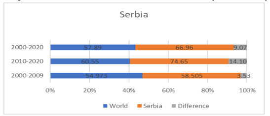 The results of the globalization index - KOF for Serbia by period show that the biggest deviation is in the second period, more precisely in the period 2010-2020. (14,10). The average value of the KOF index for the period 2000-2009. shows a positive difference in favor of Serbia (3.53), which is significantly higher in the following period. Nevertheless, viewed in summary, Serbia has a higher mean value of the KOF index by 9.07 index points.