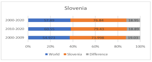 The results of the globalization index - KOF for Slovenia by period show that the mean deviation in all three periods is similar. The mean value of the KOF index for the period 2000- 2009. shows a positive difference in favor of Slovenia, which is significantly higher in the following period. Nevertheless, viewed in summary, Slovenia has a higher mean value of the KOF index by 18.95 index points.