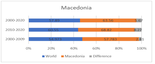 The results of the globalization index - KOF for Macedonia by period show that the biggest deviation is in the second period, more precisely in the period 2010-2020. (8,27). The mean value of the KOF index for the period 2000-2009. shows a positive difference in favor of Macedonia, which is significantly greater in the following period. Nevertheless, viewed as a whole, Macedonia has a higher mean value of the KOF index by 5.67 index points.