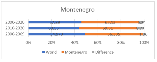 The results of the globalization index - KOF for Montenegro by period show that the biggest deviation is in the second period, more precisely in the period 2010-2020. (8.77). The mean value of the KOF index for the period 2000- 2009. shows a positive difference in favor of Montenegro, which is significantly higher in the following period. Nevertheless, viewed in summary, Montenegro has a higher mean value of the KOF index by 5.24 index points.