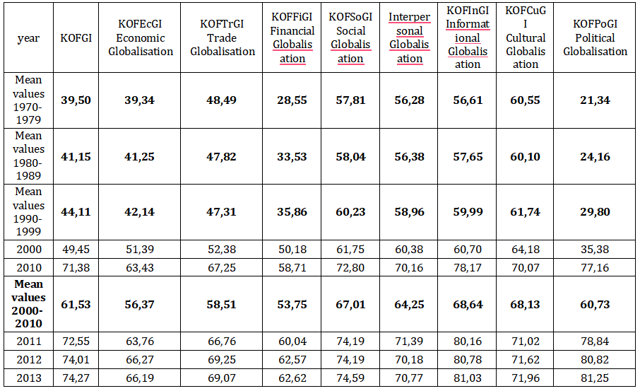 Table 5. Values of the KOF index for Serbia in the period from 1970-2020