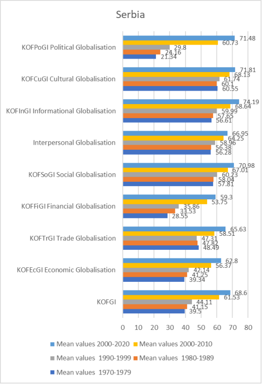 The analysis of the values shown in table 5 shows that Serbia has made significant progress in recent years and that the value of the KOF index has increased. Mean values for 1970-1979 is 39.5 index points and in the following period 1980-1989 is 41.15 index points. The value of the index did not change significantly in the following ten-year period and amounts to 44.11 index points. Only the period after 2000 brought more serious changes in the KOF index. Thus the value of the index for the period 2000-2020 amounts to 68.6 points.