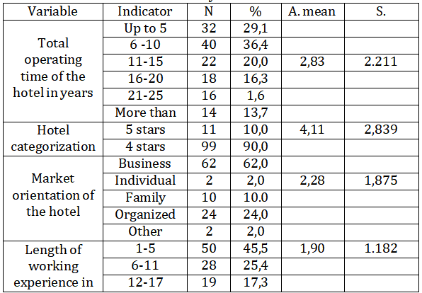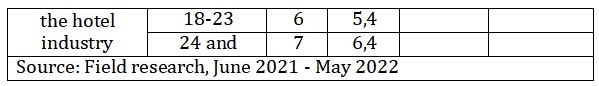 According to the market segment, 76 hotels (75%) are designed for business people, while 25 facilities are focused on addressing the demands of organized travel and group visitors. Hotel managers, particularly human resources managers, filled out the most surveys, followed by managers of special organizational units (a total of 55 respondents or 50%), receptionists (30 respondents), and other hotel workers (referees with 25 from the questionnaire). In terms of work experience, the questionnaires were largely filled out by personnel working in hotels for 1 to 5 years (55 or 50% of the total). From the perspective of the category, 99 4-star hotels and 11 5-star hotels in the territory of the Republic of Serbia were included in the survey.