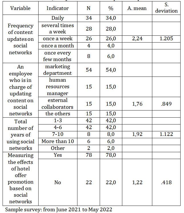 Table 2 Application of social networks in the promotion of 4- and 5- star hotel offers in Serbia in 2021, results of descriptive statistical analysis