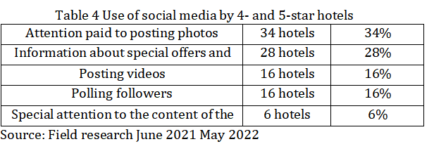 Practice of application of social networks in the promotion of 4- and 5-star hotel offers in Serbia during 2021 is presented in Table 2.