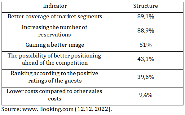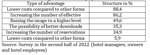 Hotels choose to have a more intense presence on various social networks to be better and more complete in as many parts of the tourist market as possible. As a consequence, this activity achieves the primary aim of increasing the quantity and dynamics of hotel lodging bookings. The second aim, which is only in third place of importance, is the acquisition and preservation of a greater degree of image or recognition of the specific hotel in the turbulent tourism market. The second advantage of such hotels that make extensive use of social networks is a desirable ranking based on hotel guests' evaluations, which they put down on various social networks as an impression of their stay in a particular hotel. Finally, the management feels that the hotel's presence on social networks enables the hotel to have cheaper business expenses compared to the previous time, on the one hand, and compared to rivals at the destination, on the other.