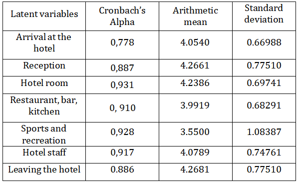 The data collected from the surveys collected from the hotels in the sample were analyzed in more detail. A more detailed analysis of the data was carried out using the SPSS statistical package. The results of descriptive statistics and Cronbach's alpha are shown in the following table where the respondents gave the highest marks to (1) reception service during check-in and check-out (4.26), (2) hotel room (4.23), and (3) hotel staff (4.07). The arithmetic mean of all latent variables in the model ranges from 3.55 to 4.27, with a standard deviation from 0.67 to 1.08 in the given period.