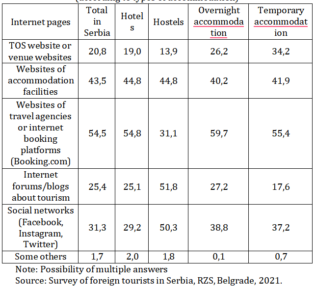 Table 8 Internet as a source of information for foreign tourists (according to types of accommodation)