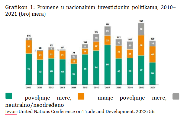 U periodu od 2010. do 2021. godine imamo smene perioda rasta i pada usvojenih mera investicione politike (grafikon 1). Najviše usvojenih mera je ostvareno 2020. godine (152) a najmanje 2014. godine (74). Najveći broj povoljnijih mera koje zemlje uvode da bi olakšale priliv SDI i deluju u korist investitora je ostvaren 2017. godine (98) a najmanji 2014. godine (52). U 2020. godini je usvojeno najviše manje povoljnijih mera koje otežavaju priliv SDI i ne deluju u njihovu korist, dok je taj broj najmanji u 2014. godini