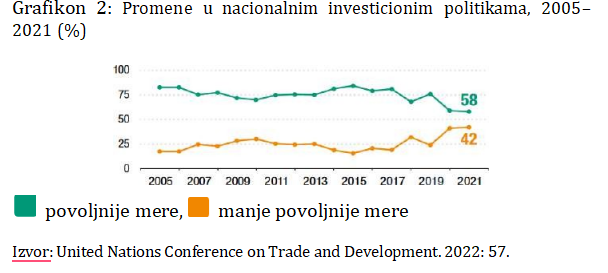 Razlika između povoljnijih (58%) i manje povoljnijih mera (42%) po investitore se smanjuje, što je pokazatelj rasta restriktivnosti nacionalnih investicionih politika (grafikon 2).