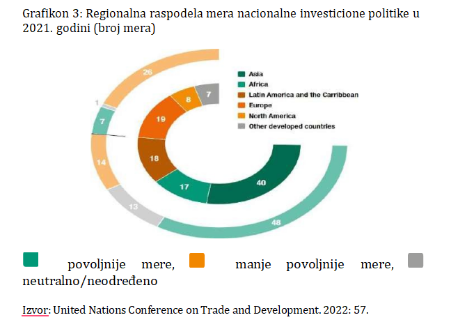 Što se tiče regionalne raspodele mera nacionalne investicione politike (grafikon 3) u 2021. godini u 75 zemalja u razvoju (40 iz Azije, 17 iz Afrike i 18 iz Latinske Amerike i Kariba) je usvojeno 48 povoljnijih (87%), 14 manje povoljnijih (35%) i 13 neutralnih mera za investitore (93%). U 34 razvijene zemlje (19 iz Evrope, 8 iz Severne Amerike i 7 drugih razvijenih zemalja) je usvojeno 7 povoljnijih (13%) 26 manje povoljnijih (65%) i 1 neutralna mera za investitore (7%). Ovi podaci nas upućuje na zaključak da su SDI ključni element u strategijama ekonomskog oporavka zemalja u razvoju. Pored olakšavajućih mera koje imaju za cilj pojednostavljenje administrativnih procedura, često ova grupa zemalja koristi razne podsticaje, kako bi privukle što vise SDI na svoju teritoriju. U razvijenim svetskim privredama svedočimo procesu razbijanja globalnih lanaca vrednosti i jačanju regionalnih lanaca vrednosti (Bjelić, 2022).