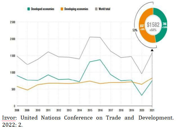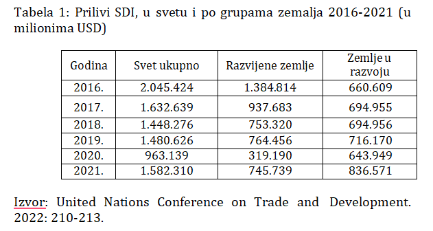 Posmatrajući grafikon 4 zapažamo da su do 2019. godine razvijene zemlјe prednjačile u prilivima SDI, nakon čega zemlje u razvoju po prvi put preuzimaju primat (tabela 1).