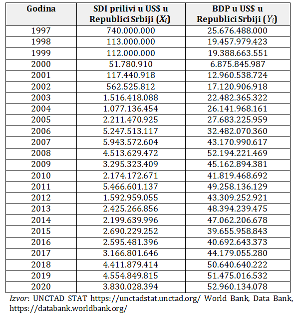 Na osnovu rezultata deskriptivne statističke analize doći će se do saznanja o minimalnoj, maksimalnoj i prosečnoj vrednosti istraživanih varijabli, zatim o prosečnom godišnjem odstupanju i o rasporedu distribucije frekvencija u odnosu na normalan raspored. Osnovnim zadatkom deskriptivne statistike smatra se procena napoznatih parametara i drugih statističkih analitičkih veličina (Šoškić, 2004). Ispitivanje međuzavisnoti SDI priliva i vrednosti BDP u Republici Srbiji biće sprovedeno primenom linearne regresije i korelacije. Poći će se od postavljanja jednačine linearnog regresionog modela i tumačenja dobijenih parametara, zatim će se izračunati koeficijent determinacije koji će ukazati na reprezentativnost postavljenog linearnog regresionog modela, a nakon toga i koeficijent korelacije kako bi se došlo do saznanja o jačini i prirodi veze između istraživanih varijabli. Radi prikupljanja kvantitativnih istraživačkih podataka primenjena je desk metoda i korišćeni su sekundarni izvori podataka, odnosno baza podataka Svetske banke o vrednostima BDP u Republici Srbiji i UNCTAD baza potadaka o vrednostima priliva stranih direktnih investicija. Zavisna promenljiva (Yi ) je vrednost BDP Republike Srbije iskazana u US$, ostvarena u vremenskom period od 1997. do 2020. godine, dok je nezavisna promenljiva (Xi ) vrednost SDI priliva u US$ koji su pristigli u Republiku Srbiju u istom vremenskom razdoblju.