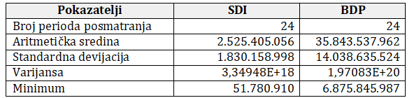 U istraživanju će se prvo sprovesti deskriptivna statisitčka analiza, a zatim i linearna regresija i korelacija između vrednosti priliva SDI i vrednosti BDP u Republici Srbiji u vremenskom periodu od 1997. do 2020. godine.