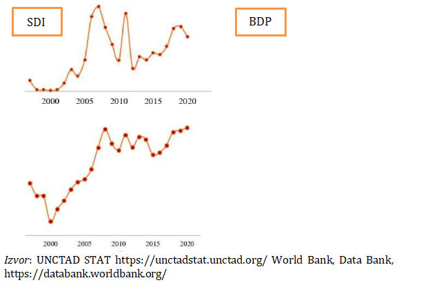 Grafikon 1. Kretanja SDI priliva i BDP u Republici Srbiji u periodu od 1997. do 2020. godine
