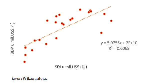 Jednačina modela linearne regresije međuzavisnosti vrednosti BDP i SDI priliva u Republici Srbiji u period od 1997. do 2020. godine glasi: