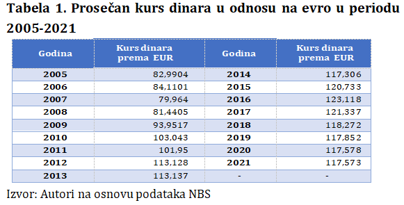 Cilj ovog istraživanja je da se, korišćenjem programa „The Statistical Package for the Social Sciences“ - SPSS utvrdi koje nezavisne varijable utiču na javni dug Republike Srbije, odnosno da se odaberu varijable za razvijanje i procenu modela koji će pokazati značajan odnos sa javnim dugom. Efikasnost procene je izmerena koeficijentom determinacije (R²), koji predstavlja kvadrat višestruke korelacije. Koeficijent determinacije objašnjava procenat varijacije zavisne varijable definisanim nezavisnim varijablama. Izvori podataka za ovo istraživanje jesu zvanični statistički podaci Narodne Banke Srbije. Sve vrednosti u ovom radu su iskazane u evrima radi mogućnosti poređenja, te je u skladu sa time za podatke koji izvorno nisu bili iskazani u evrima uzeta prosečna vrednost evra na godišnjem nivou. Prosečna vrednost dinara u odnosu na evro u posmatranom periodu je takođe preuzeta sa sajta Narodne Banke Srbije, što je i prikazano u Tabeli 1. Podaci koji nisu izvorno iskazani u evrima jesu podaci o fiskalnom bilansu Republike Srbije. Oni su na sajtu Narodne Banke Srbije bili iskazani u dinarima, te je za njihovo iskazivanje u evrima korišćena pomenuti prosečan kurs dinara u svakoj od posmatranih godina.