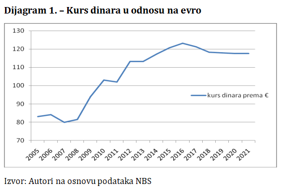 Navedeni kurs dinara u odnosu na evro možemo posmatrati i kroz Dijagram 1. Radi lakšeg praćenja kretanja po godinama.