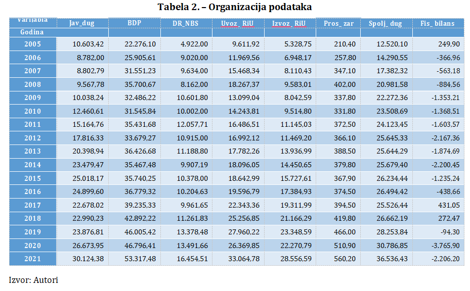 Analizom je obuhvaćen sedamnaestogodišnji period u Republici Srbiji, period od 2005. do 2021. godine u kome je posmatran uticaj više nezavisnih varijabli (definisane u daljem radu) na jednu zavisnu varijablu, odnosno na Javni dug (Jav_dug).